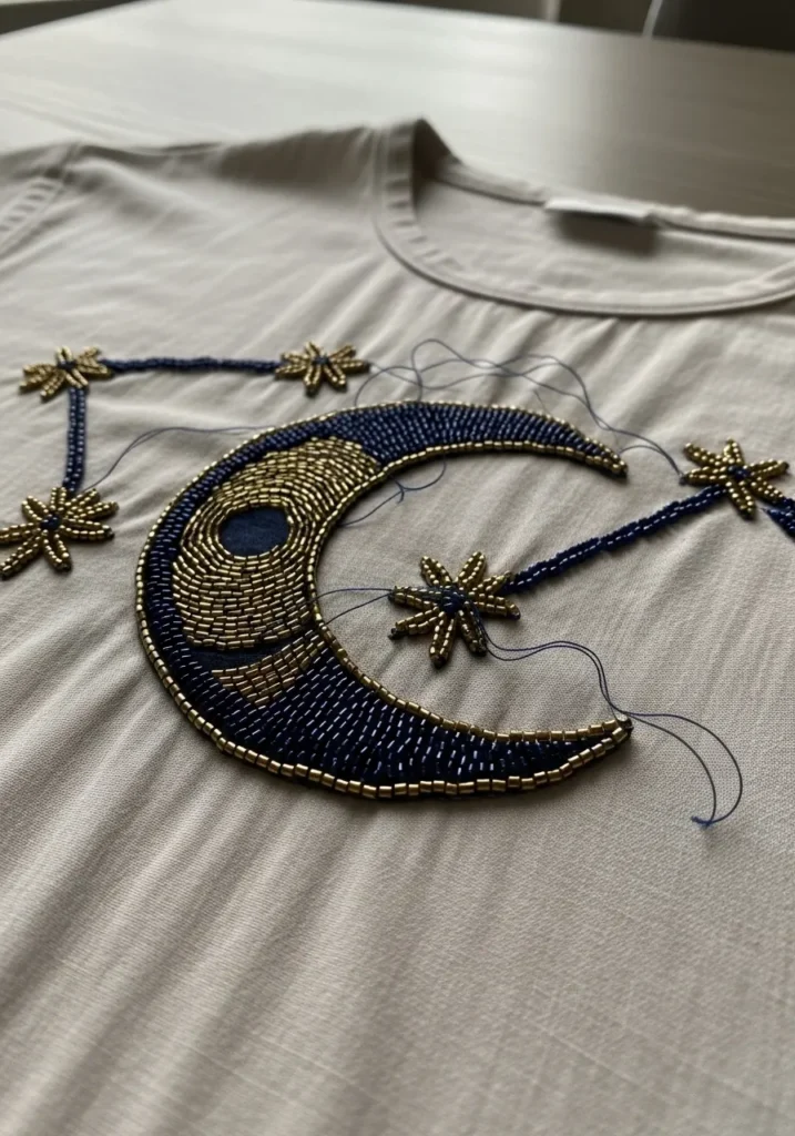 I absolutely adore this kind of design because it feels bold yet dreamy at the same time. It turns a simple shirt into a statement piece without being over the top. If you are into celestial themes or just want something that feels magical and artsy, this is such a fun idea to try. I love how you can play with bead colors and star placements to make it completely your own. It is one of those projects that looks impressive but is surprisingly relaxing once you get into the rhythm of stitching.