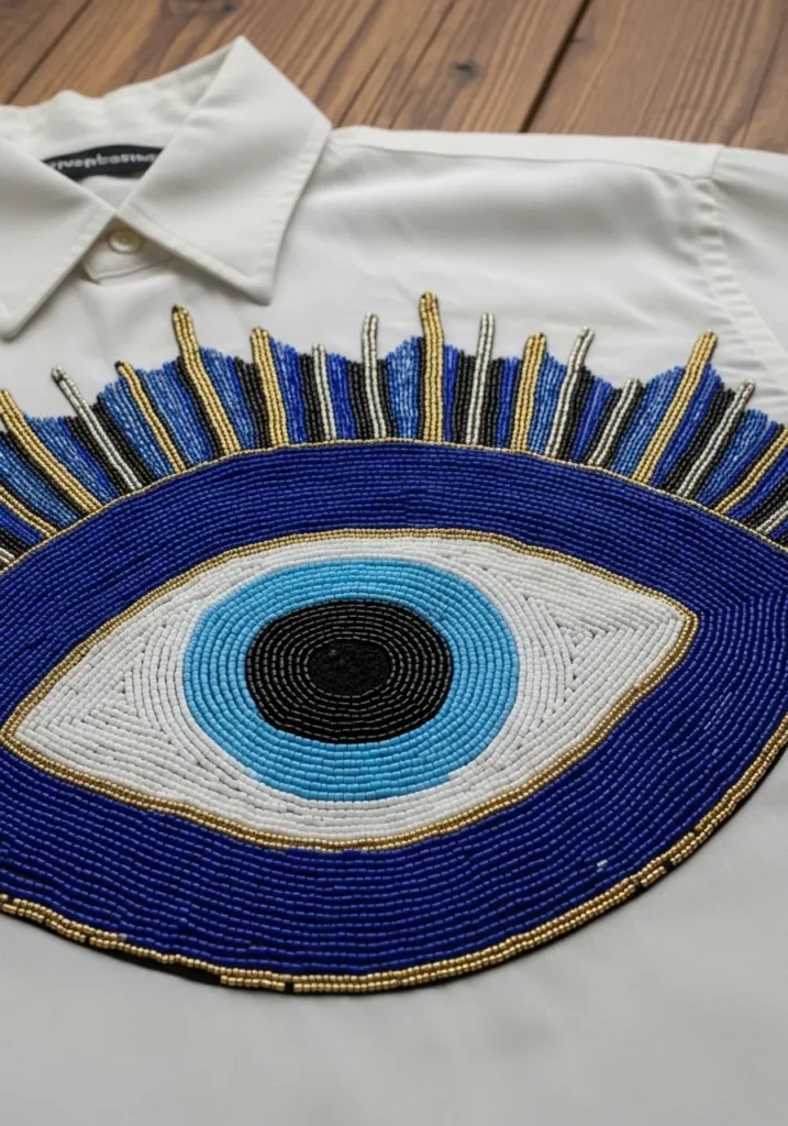 This beaded embroidery shirt features a striking oversized evil eye design stitched across the front of a crisp white button down. Layers of tiny seed beads in deep royal blue, bright cobalt, sky blue, white, and black form the eye shape with beautiful precision. A thin outline of gold beads frames the design, adding a subtle shimmer that makes the whole motif pop. The upper lashes are created with vertical rows of blue, black, and gold beads, giving the eye a dramatic and slightly graphic look that feels modern and powerful.