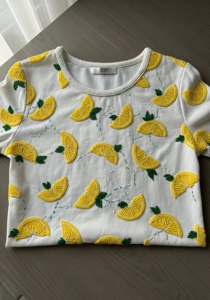 I love how light and happy this shirt feels. It instantly brings summer vibes to even the simplest outfit. If you are into fruity patterns or want something that feels fresh and fun, lemon slices are such a cute and beginner friendly idea to try. Stitching the little wedge shapes is surprisingly easy, and repeating them across the fabric makes the whole process feel relaxed and satisfying. It is the kind of project that makes you smile every time you wear it.