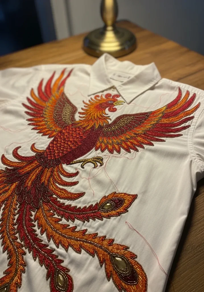 This beaded embroidery shirt showcases a magnificent phoenix spreading its wings across a crisp white button down. The bird is stitched with layers of red, burnt orange, golden yellow, and deep copper beads that create a rich flame like effect. Each feather is carefully outlined and filled with tiny seed beads arranged in flowing rows, giving the wings and tail beautiful movement and texture. The long tail plumes cascade downward with dramatic curves, making the whole design feel powerful and full of life.