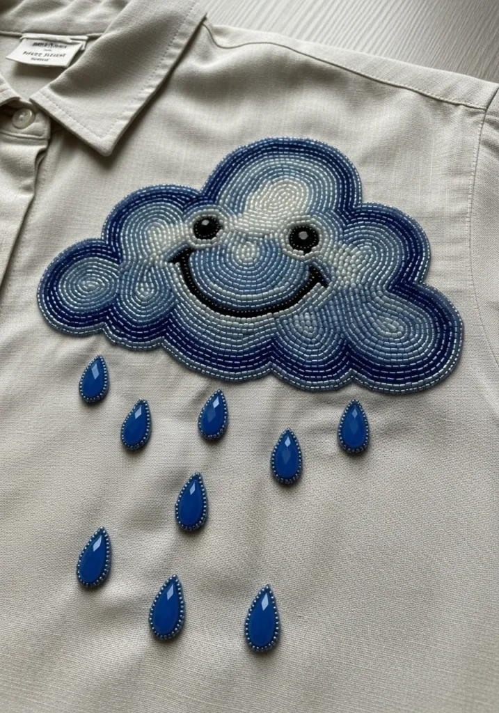 This beaded embroidery shirt features the cutest little rain cloud stitched onto a soft neutral button down. The cloud is built from swirling rows of light blue, icy blue, and deep navy seed beads that create a lovely textured effect. Tiny black beads form the happy eyes and curved smile, giving the cloud a sweet personality. Below it, glossy teardrop shaped blue embellishments hang like raindrops, each outlined with delicate beadwork for extra sparkle and dimension.