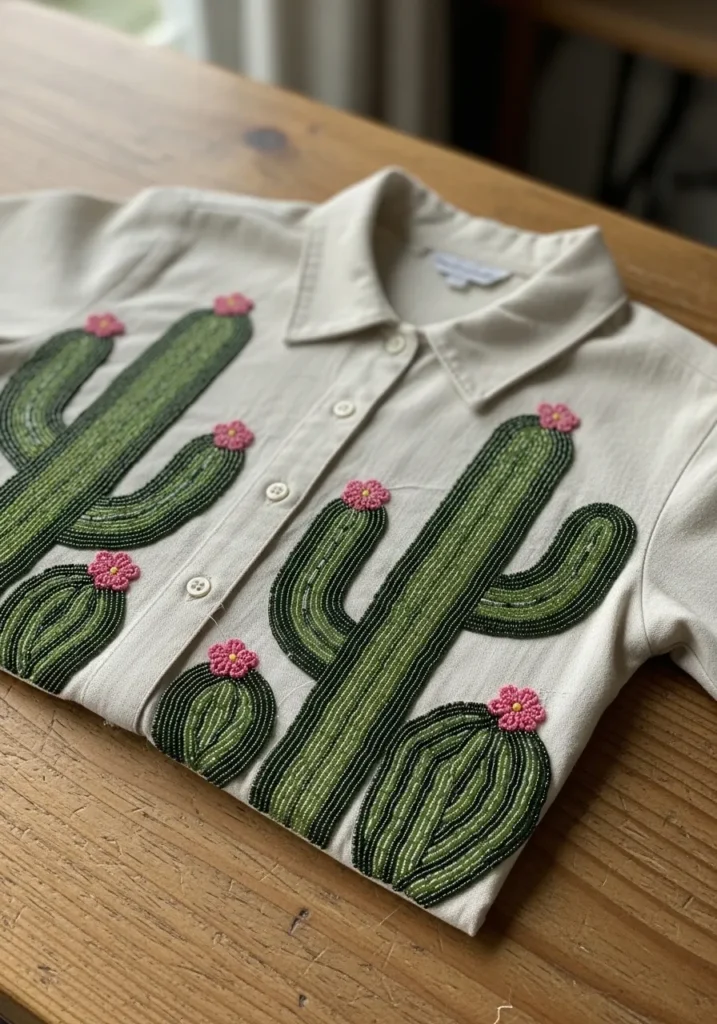 • Playful Cactus Garden Beaded Embroidery Shirt