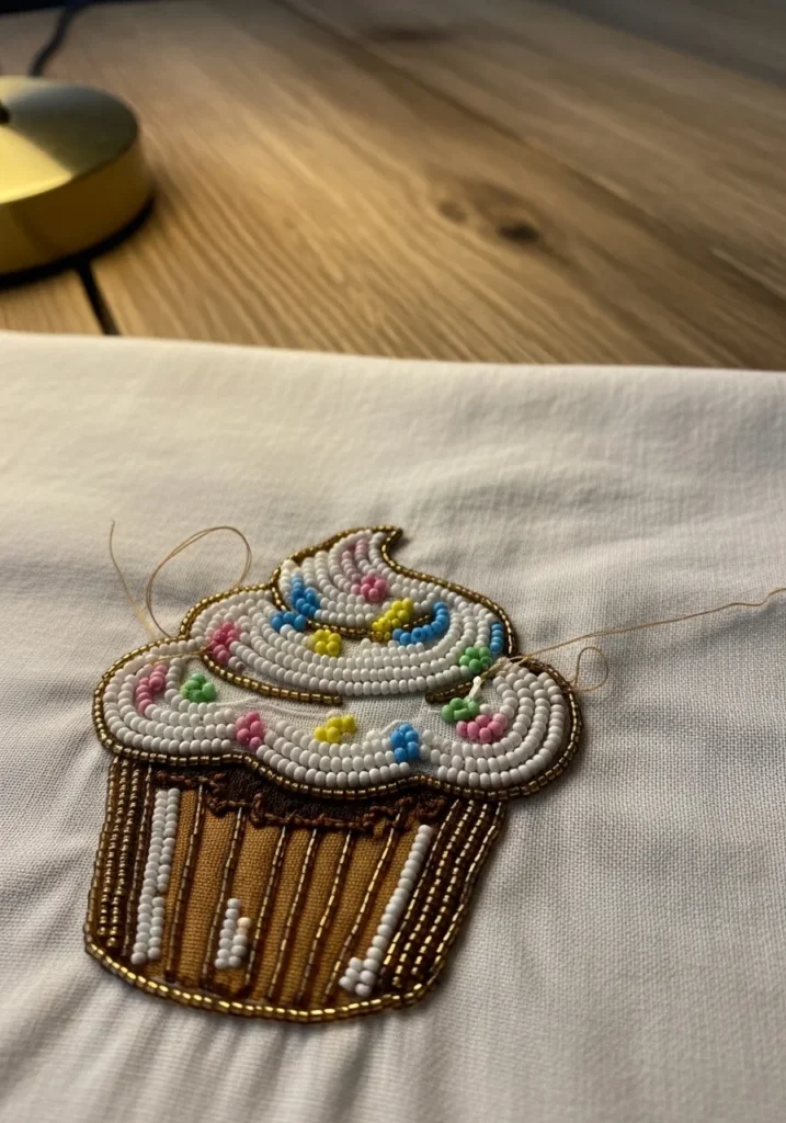 I honestly think this is such a fun and lighthearted design to try. It feels playful without being over the top, and it instantly adds personality to a basic shirt. If you love food inspired crafts or enjoy adding a bit of humor to your wardrobe, a beaded cupcake is such a sweet project. Stitching the frosting swirl is surprisingly relaxing, and placing the colorful sprinkles at the end feels like decorating a real dessert. It is the kind of piece that makes people smile the second they see it.