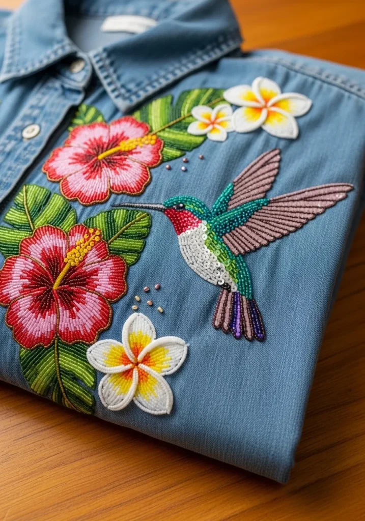 This beaded embroidery denim shirt features a vibrant hummingbird in mid flight surrounded by lush tropical flowers and layered green leaves. The bird is stitched with tiny seed beads in emerald, teal, red, white, and soft lavender, creating a beautiful shimmer across its wings and chest. Large hibiscus style blooms in rich pink and coral tones sit beside delicate white plumeria flowers with sunny yellow centers. The mix of smooth beadwork and tightly stitched embroidery thread adds depth and texture, while the structured denim background makes every color pop even more.