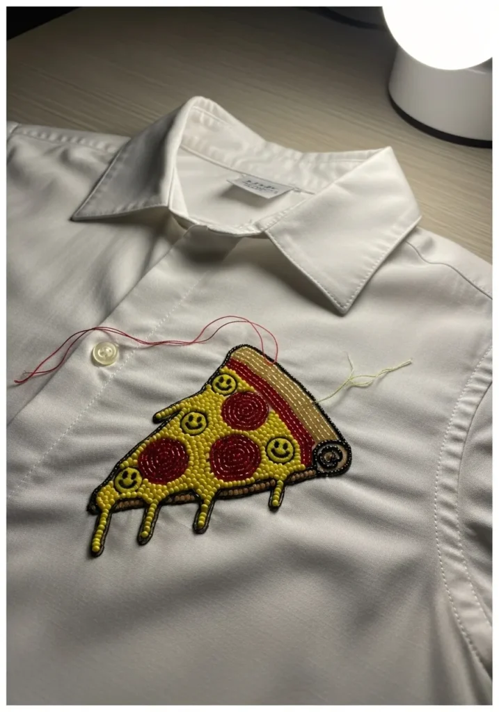This beaded embroidery shirt turns a simple white button down into a total conversation starter with a bold slice of pizza stitched right on the front. The slice is outlined in tiny black beads and filled with bright yellow seed beads for the cheesy base, glossy red beaded pepperoni, and a golden crust edge. Little smiley faces are tucked between the toppings, adding a cheeky twist that makes the whole design feel extra fun. You can even spot a few loose threads and slight bead variations, which give it that perfectly imperfect handmade charm.
