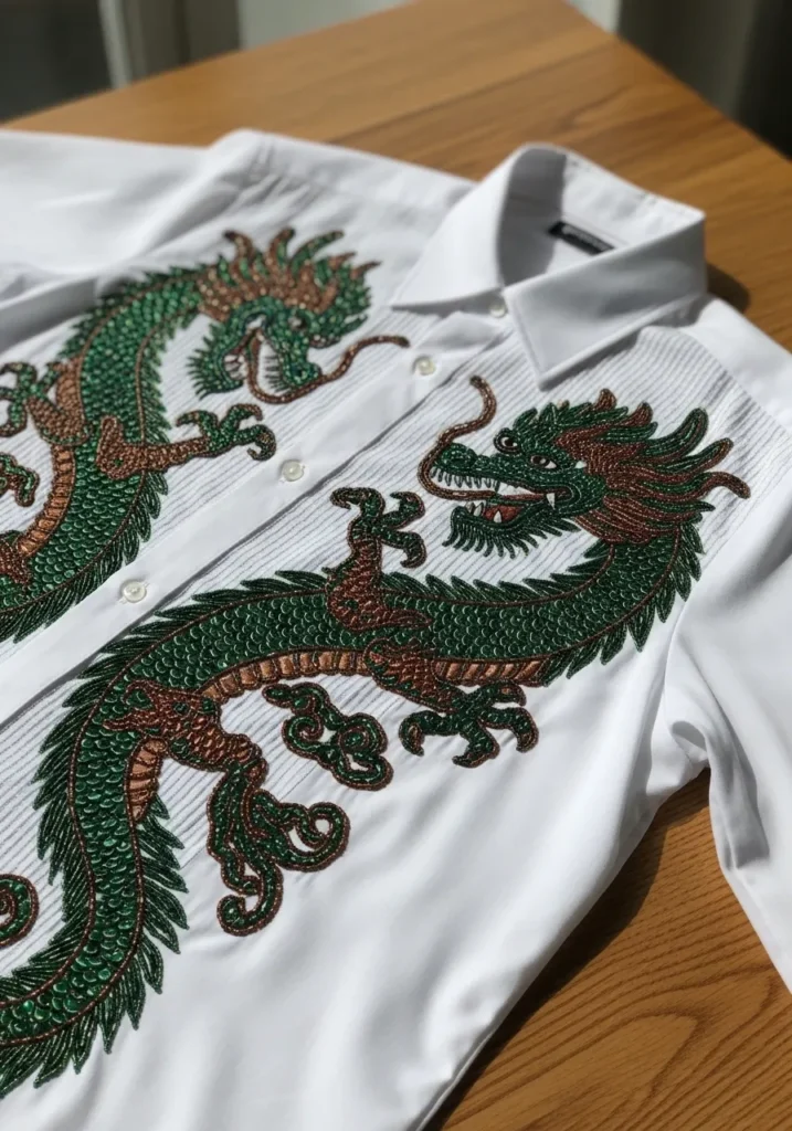 This beaded embroidery shirt features a striking dragon design sweeping across the front of a crisp white button down. The dragon is stitched with deep emerald green beads layered to create textured scales, while rich bronze and copper beads define the claws, mane, and flowing details. Tiny beadwork outlines shape the fierce eyes and curved body, giving the creature a sense of movement and drama. The contrast between the clean white fabric and the dense, shimmering bead embroidery makes the dragon feel bold and powerful without overwhelming the shirt.