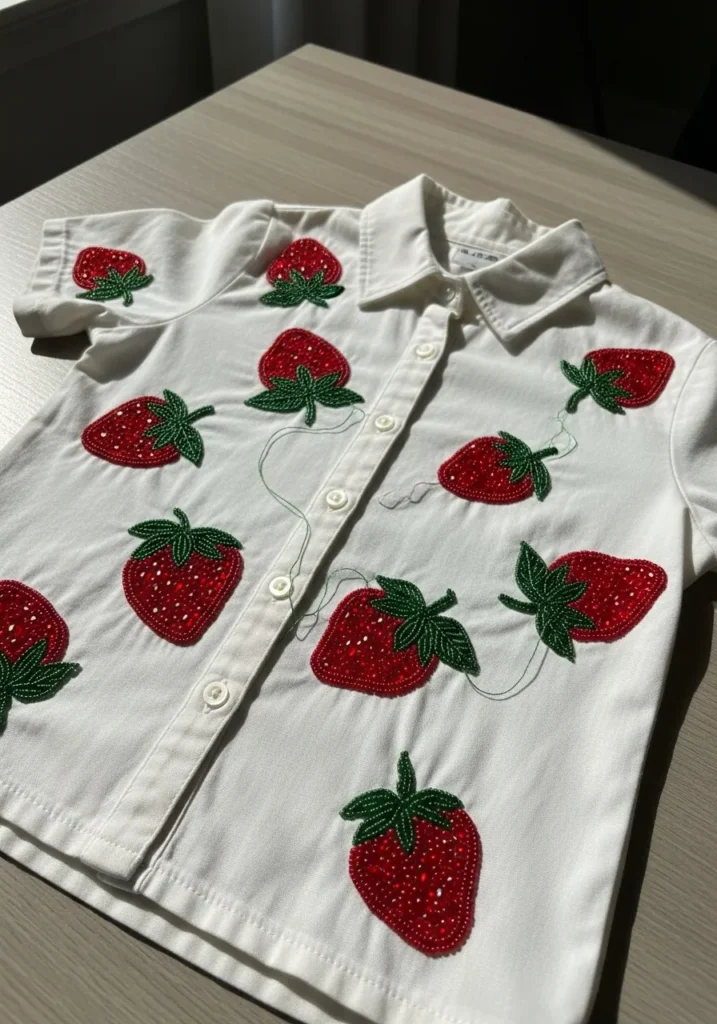 • Sweet Strawberry Patch Beaded Embroidery Shirt