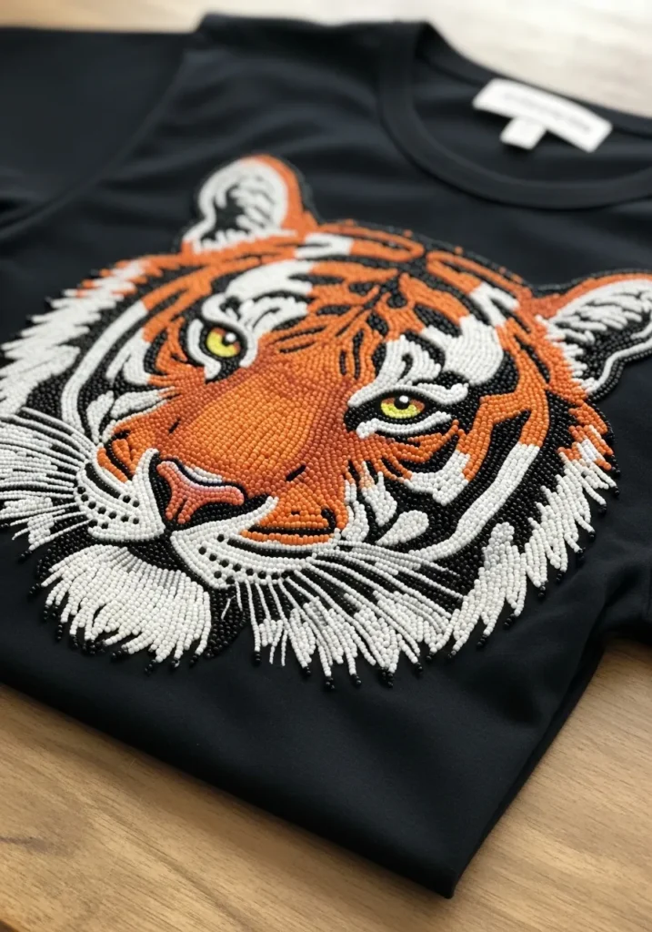 I love how powerful this piece feels without needing any extra fuss. It is the kind of shirt that does all the talking for you. If you are into strong animal motifs and statement fashion, this is such a satisfying project to take on. Stitching bead by bead to form the face is oddly calming, and seeing the expression come together is so rewarding. It turns a simple black shirt into something bold, artistic, and completely unforgettable.