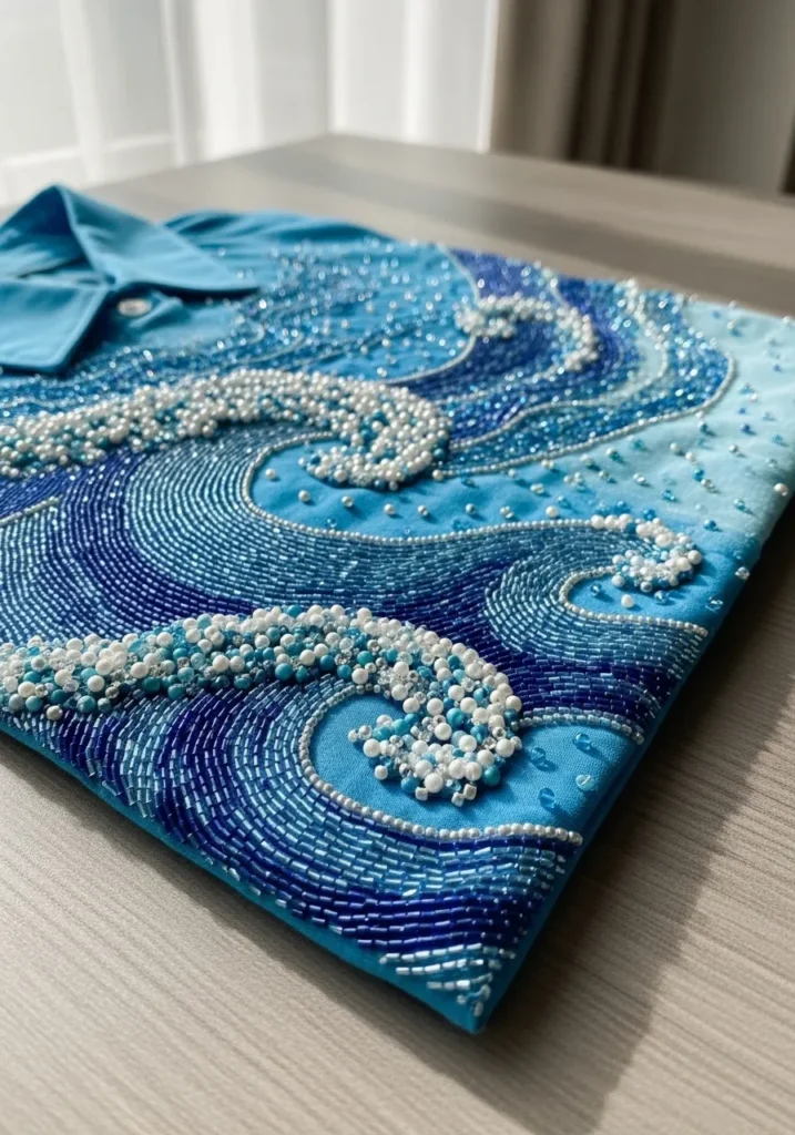 This beaded embroidery shirt captures the movement of the sea with swirling waves stitched across a turquoise base. Layers of tiny blue and navy seed beads form curved lines that flow like water, while clusters of white and soft aqua pearls create frothy foam along the crests. The mix of smooth round beads and slender bugle beads adds texture and depth, making the waves look almost three dimensional. The cool color palette feels fresh and calming, and the dense beadwork turns the shirt into a wearable piece of ocean art.
