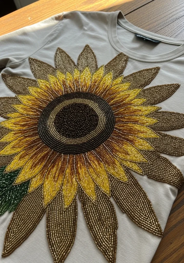 I adore how cheerful and confident this design feels. It is bright without being flashy and makes such a strong statement in the sweetest way. If you are into floral pieces but want something that truly stands out, a large beaded sunflower is such a rewarding project. Watching the petals build outward bead by bead feels so satisfying. It turns an ordinary shirt into something that looks handcrafted and full of sunshine.