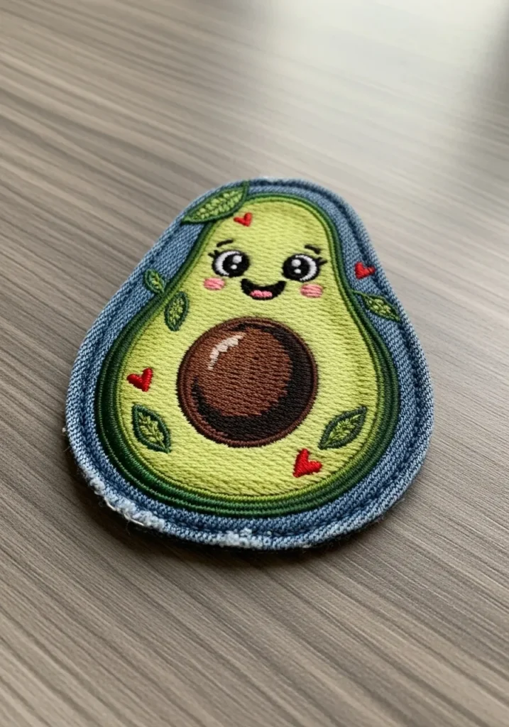 This playful embroidered patch features a smiling avocado stitched on a soft fabric base with a rounded shape that mimics the fruit itself. The design uses bright green thread for the avocado flesh, darker green for the outline, and rich brown stitching for the pit. Tiny red hearts and a cheerful face add personality and charm. The patch is edged with neat blue stitching that gives it a finished look and makes it perfect for attaching to jackets, bags, or denim.