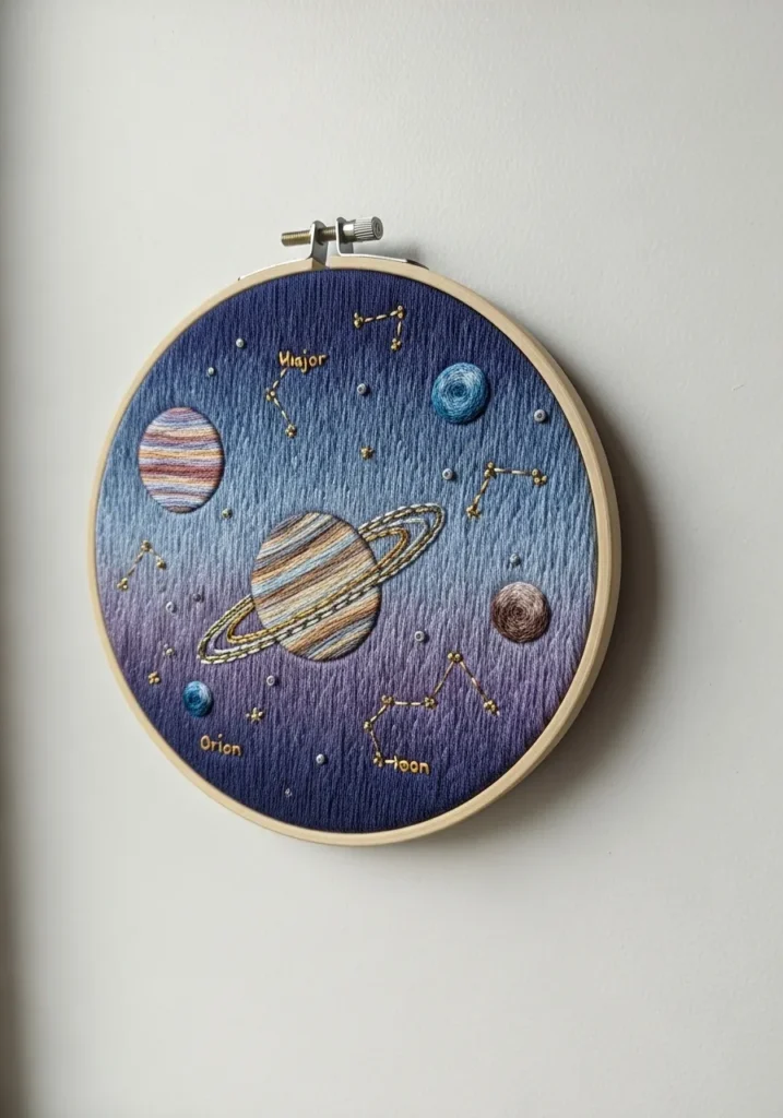 I find space themed embroidery so relaxing to work on. The tiny stars and planet details make the project feel creative without being too difficult. It is the kind of embroidery piece that looks beautiful hanging on a wall once it is finished.