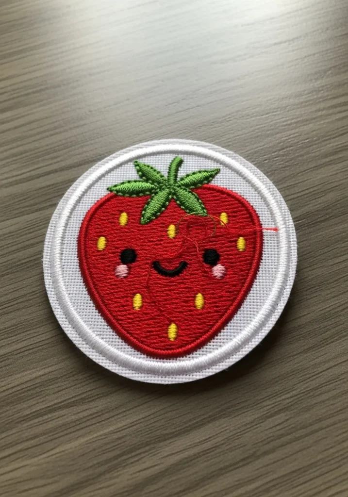 This adorable embroidered patch features a bright red strawberry with a cheerful little face. The berry is stitched with bold red thread and dotted with tiny yellow seeds. A leafy green top adds contrast while the soft white border keeps the patch looking neat and clean.
