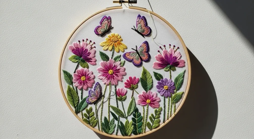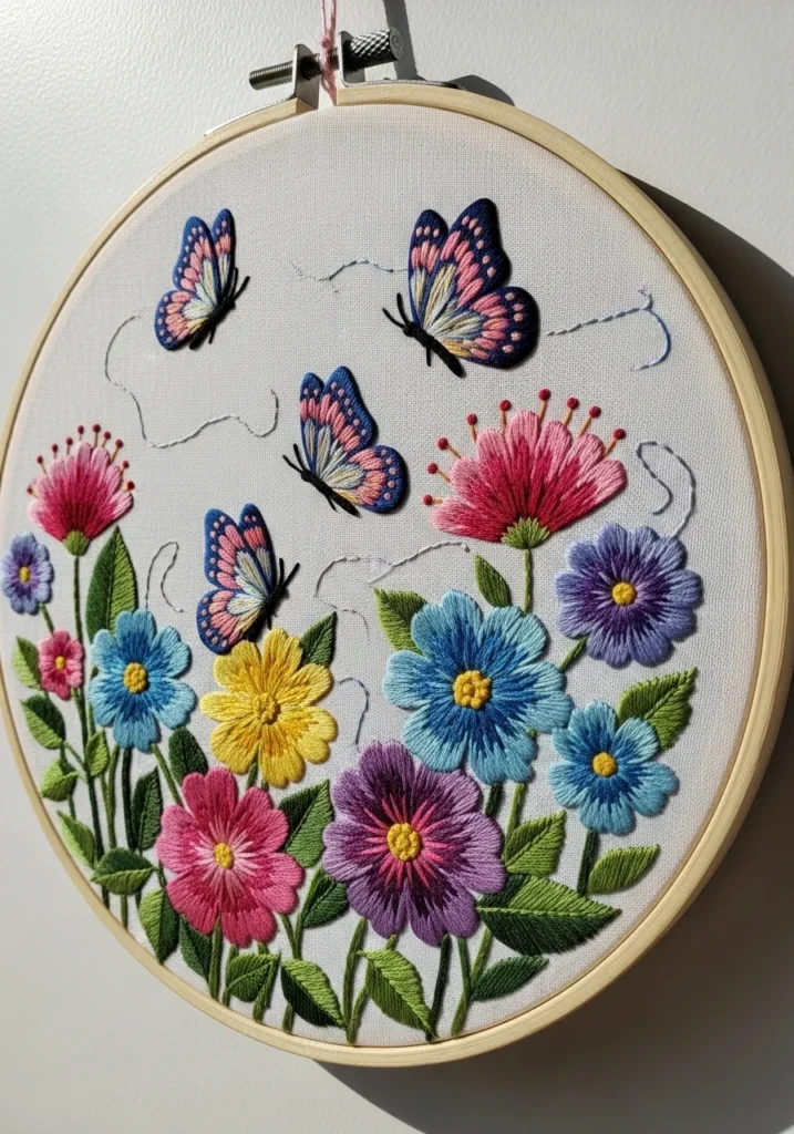 Projects like this always feel uplifting to me. Stitching the flowers one by one almost feels like planting a tiny garden on fabric. I love how the butterflies add movement and make the whole piece feel light and joyful.
