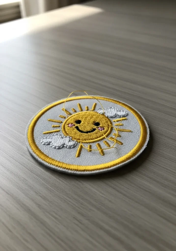 This charming embroidered patch shows a smiling sun with warm golden rays spreading outward. The sun’s face is stitched with friendly features that give the design a cheerful personality. Bright yellow thread forms the rays while a neat circular border keeps everything clean and balanced.