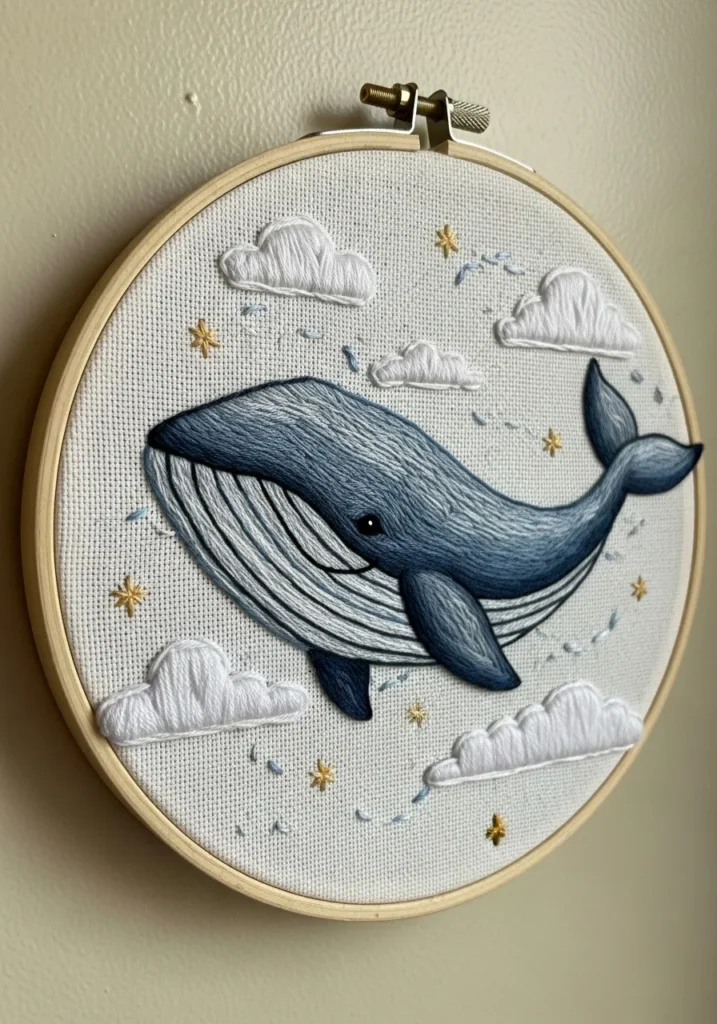 I love embroidery pieces that feel a little whimsical like this. The idea of a whale drifting through the sky always makes me smile. It is a relaxing project that lets you enjoy simple shapes while still creating something that looks magical.