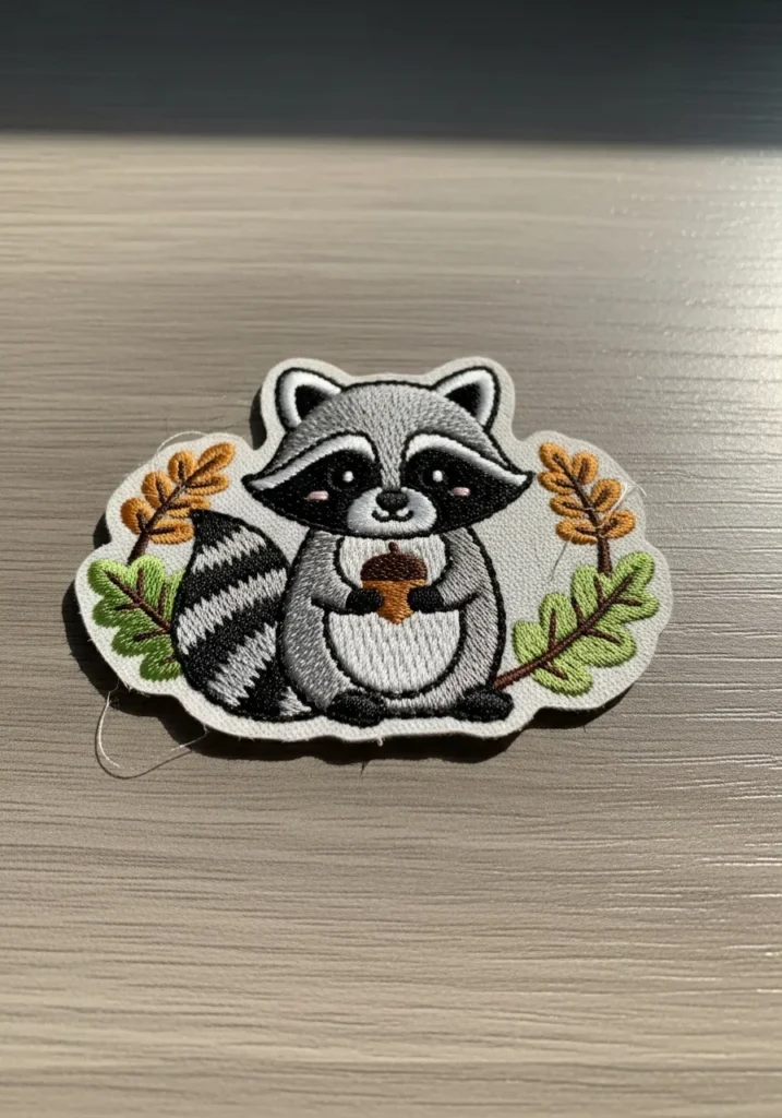 This sweet embroidered patch features a fluffy raccoon sitting among small leaves and branches. The raccoon is stitched with gray, black, and white threads that bring out its classic mask and striped tail. Warm brown leaves and soft green details frame the little animal and give the patch a cozy woodland feel.