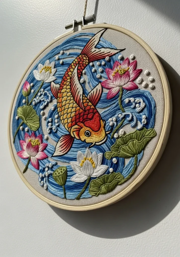 Vibrant Koi Pond Embroidery Art