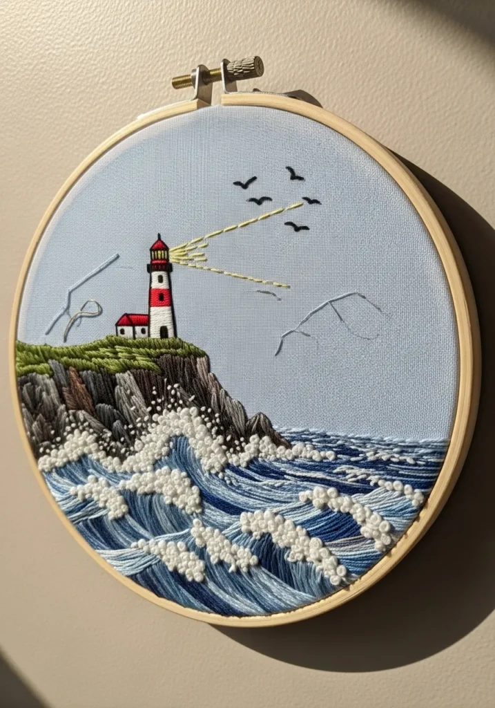 Coastal Lighthouse Embroidery Scene