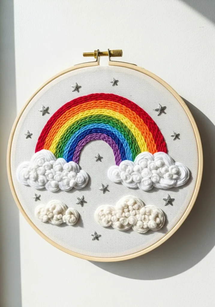 This embroidery hoop shows a colorful rainbow arching across soft fluffy clouds. Each rainbow stripe is stitched with vibrant thread in red, orange, yellow, green, blue, and purple. The clouds are made with textured white stitches that create a soft puffy effect. Tiny star details around the design give the piece a dreamy sky feel.