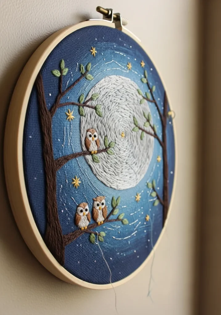 This embroidery hoop captures a magical nighttime forest with a large glowing moon in the background. A pair of small owls sit quietly on tree branches while tiny star stitches sparkle across the dark blue sky. The moon is stitched with soft pale thread which creates a gentle glow that lights up the whole scene.