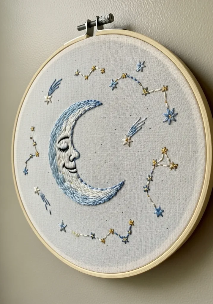 This embroidery hoop displays a peaceful crescent moon surrounded by delicate stars and constellation patterns. Soft blue thread forms the moon’s shape, while tiny golden stitches create scattered stars across the fabric. The neutral fabric background keeps the design calm and dreamy while allowing the stitched details to stand out beautifully.
