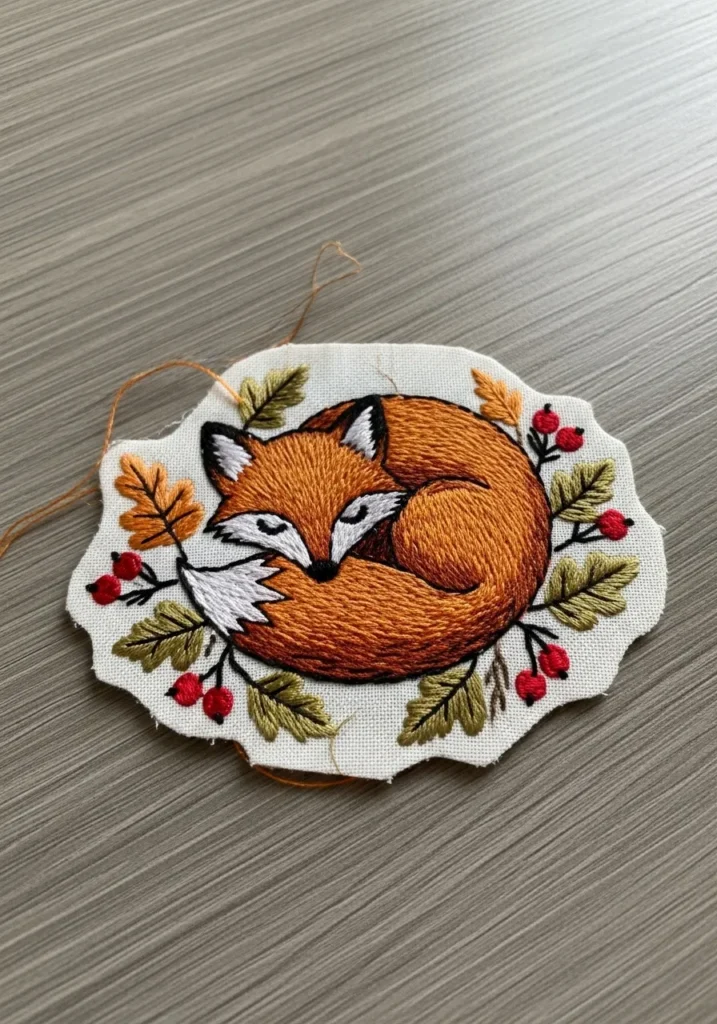 This embroidered patch shows a curled up fox resting among small leaves and berries. Warm orange thread creates the fox’s fluffy body while white stitching adds contrast for the tail and face. The surrounding leaves and tiny berries bring in soft autumn colors that frame the animal nicely.