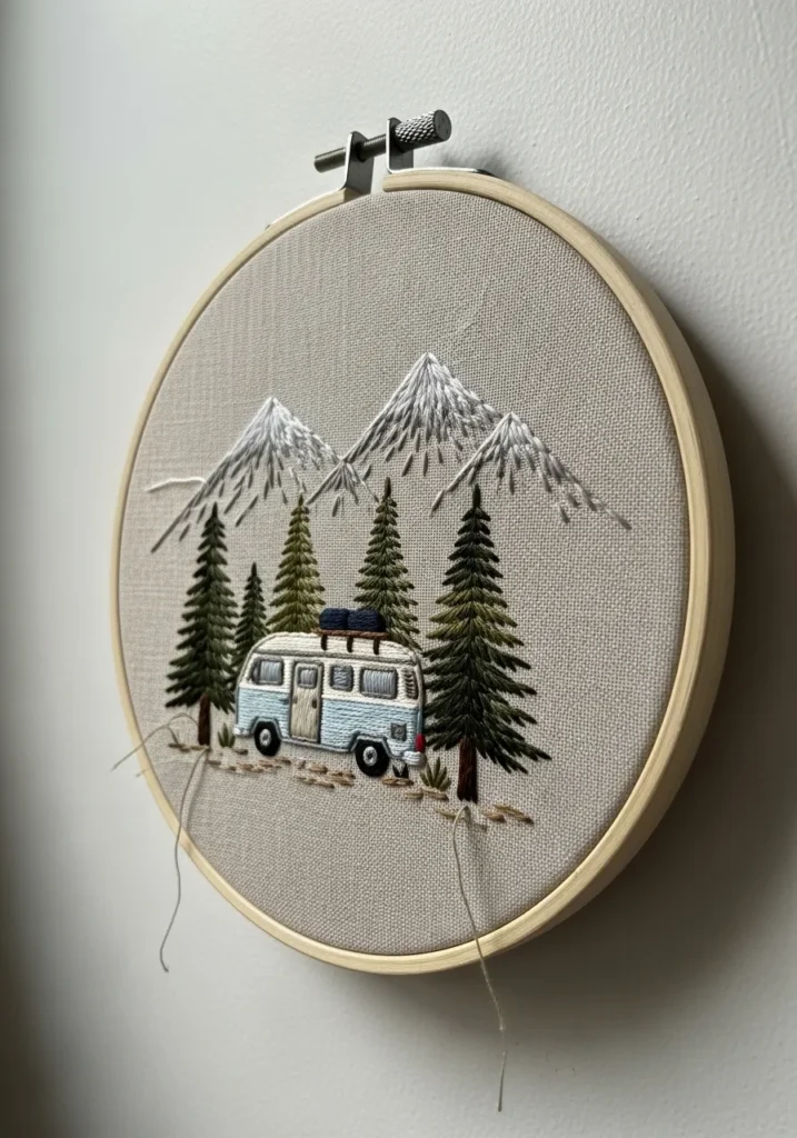 This embroidery hoop captures a peaceful outdoor scene with tall pine trees, snowy mountains, and a small camper van parked among the forest. The mountains are stitched with soft gray and white thread while the trees use deep greens that add texture and depth. The tiny camper van brings a playful travel theme to the whole design.