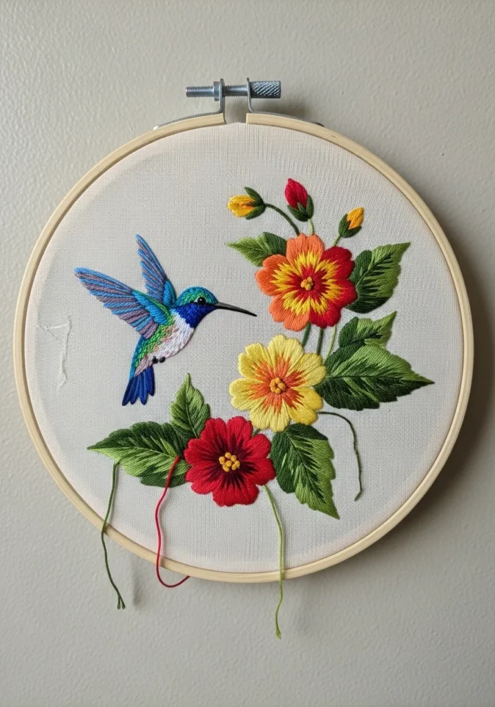 This embroidery hoop shows a graceful hummingbird hovering beside a cluster of bright flowers. The bird is stitched with soft blue and green threads that shimmer slightly against the fabric, while the flowers bloom in rich reds, sunny yellows, and warm oranges. Fresh green leaves frame the scene and add balance to the colorful design. The clean white fabric background makes every stitch stand out beautifully.