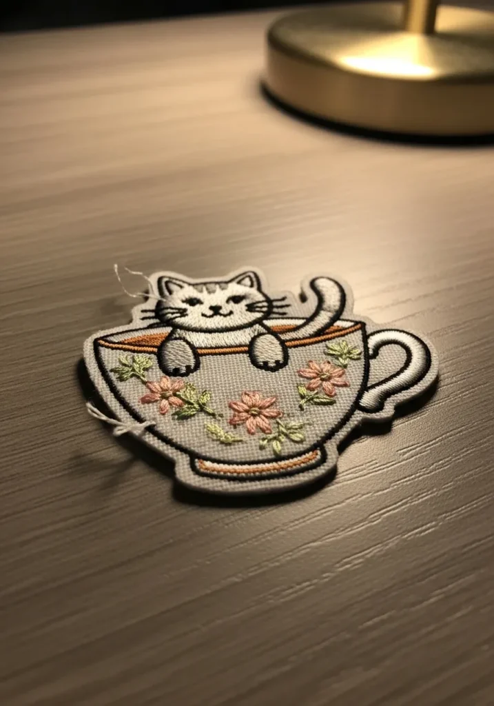 This sweet embroidered patch features a relaxed little cat sitting inside a vintage teacup. The cup is decorated with delicate floral stitching in soft pink and green tones. The cat is stitched in simple gray and white thread with a playful expression that makes the design feel warm and cozy. A neat embroidered border frames the patch and gives it a polished finish.